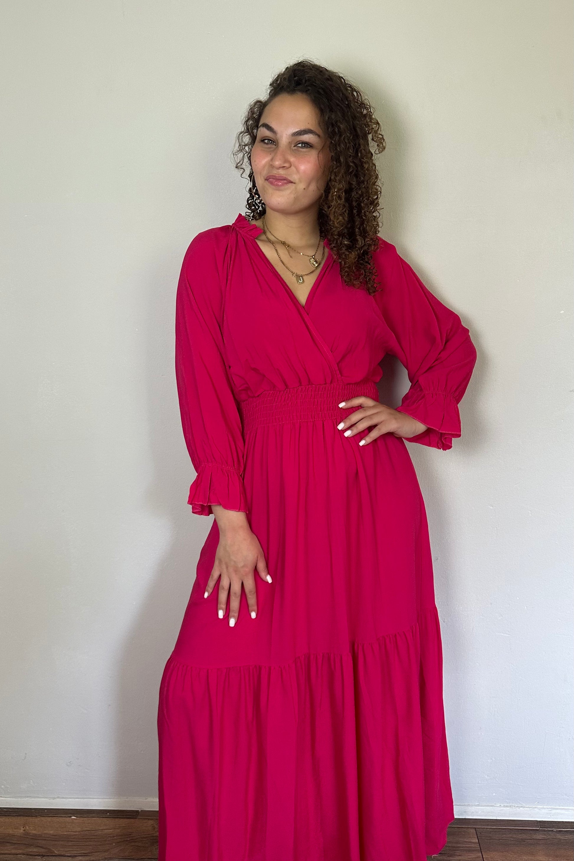 De Fuchsia Dress is one size en geschikt voor maat 34 t/m 44. Dankzij de soepele stof en flatterende snit valt de jurk mooi om het lichaam, zonder strak te zitten. Draag haar casual met sneakers of gekleed met hakken – deze jurk is veelzijdig én comfortabel.