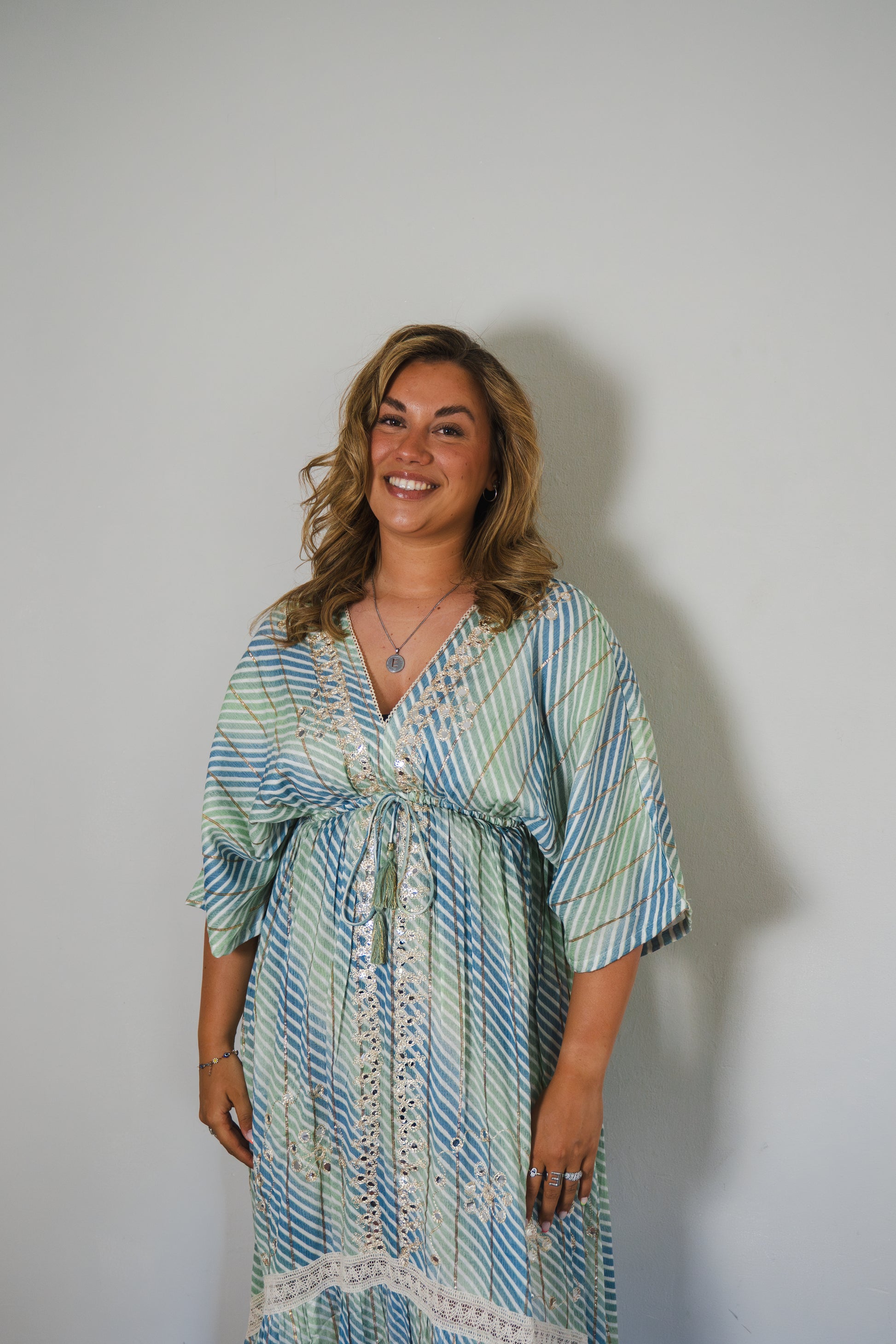 Wat deze jurk extra speciaal maakt, zijn de subtiele gouden details, die een luxe uitstraling geven zonder dat het te veel is. De ONE SIZE (maat 34 t/m 44) pasvorm zorgt ervoor dat de jurk zich moeiteloos aanpast aan verschillende lichaamstypes.