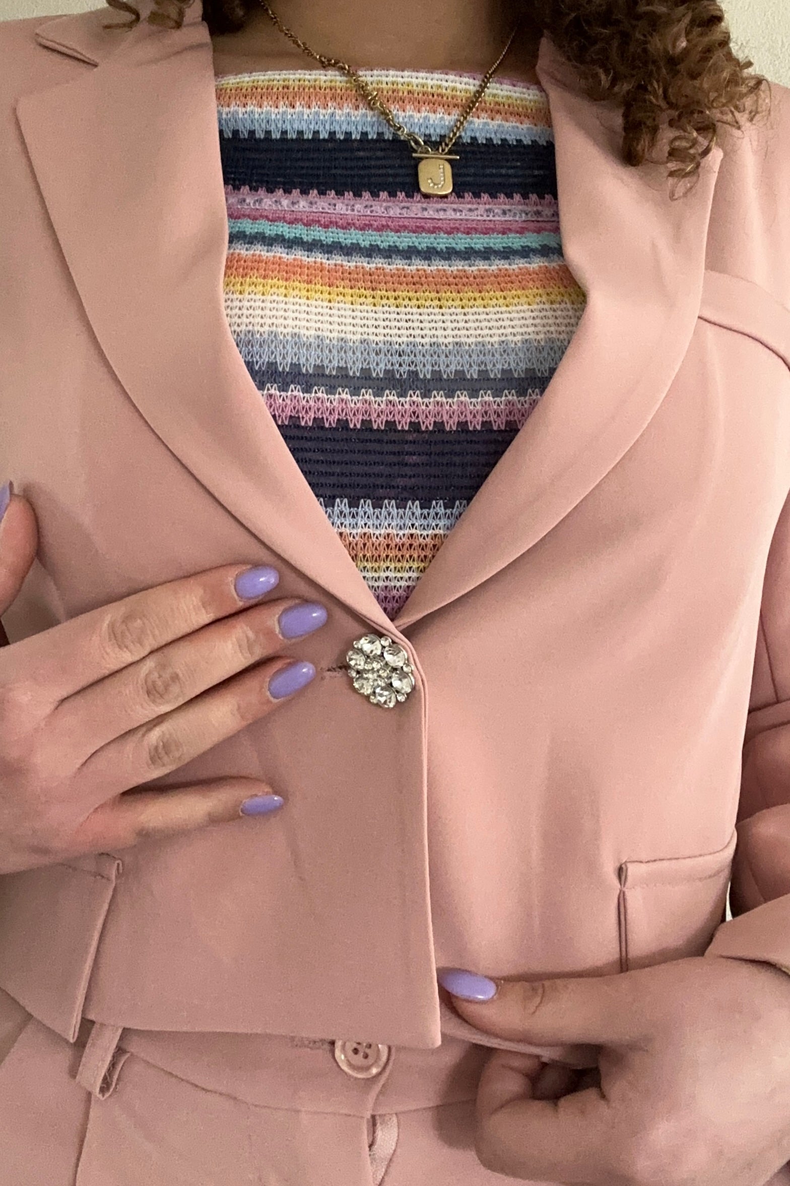 Hoe leuk is dit jasje bij de bijpassende pantalon. Je bent zo in een keer helemaal klaar voor het voorjaar!